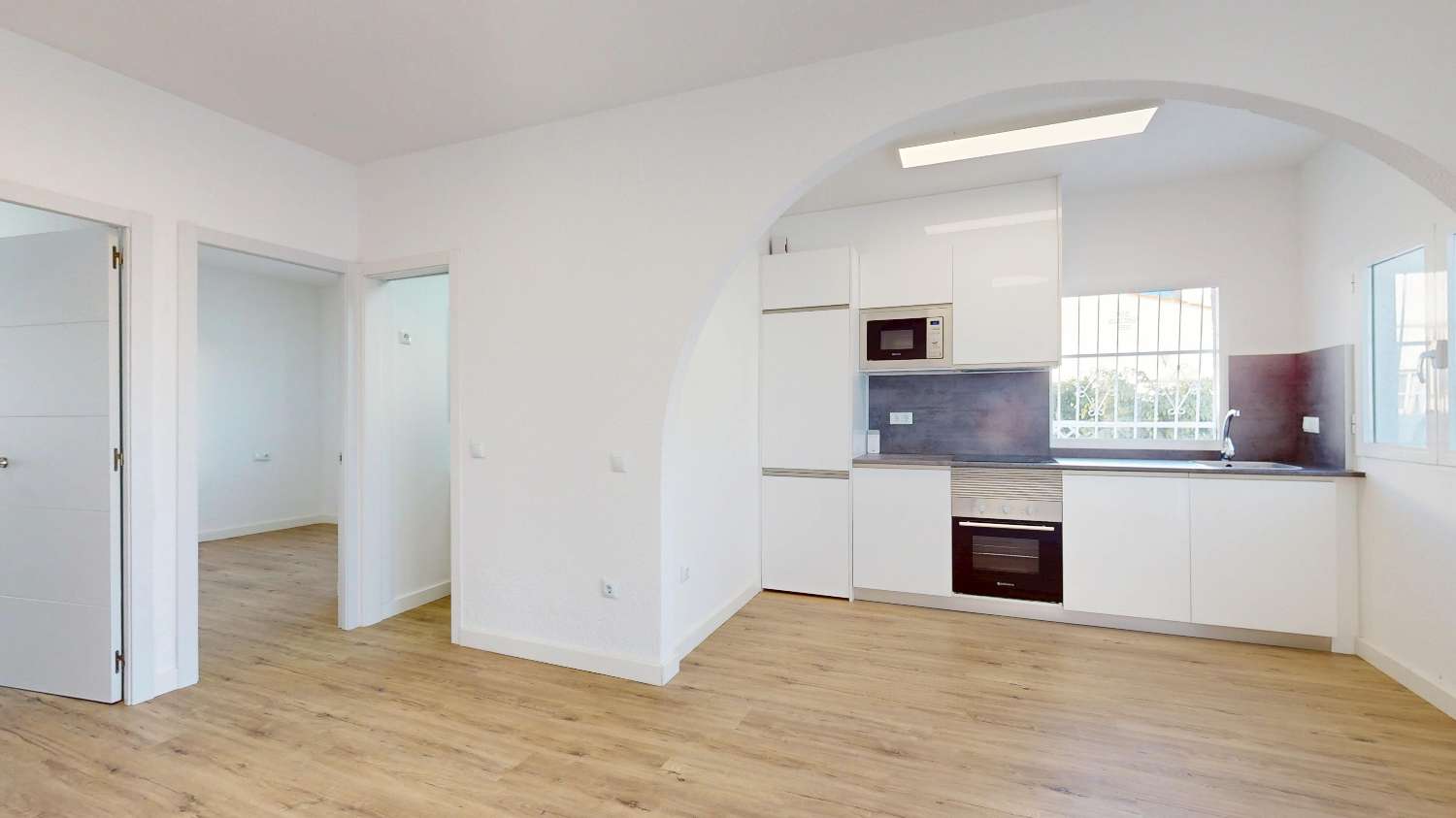 La vivienda, completamente renovada, cuenta con 2 dormitorios, 1 baño con ducha y mampara, suelo laminado imitación madera y una cocina a estrenar equipada con todos los electrodomésticos. Su solárium, con césped artificial y cerramiento de brezo, ofrece un espacio ideal para relajarse con total privacidad. Además, la amplia parcela permite que el futuro propietario pueda instalar una piscina privada si así lo desea (por su cuenta).