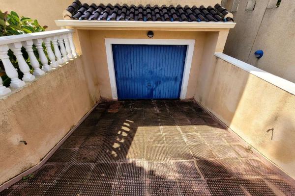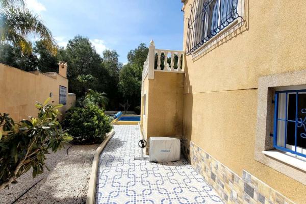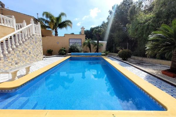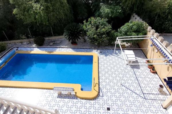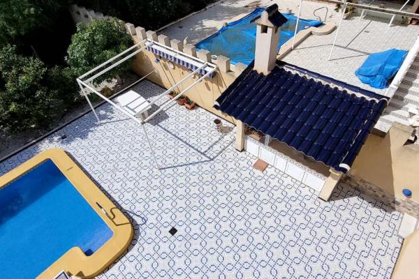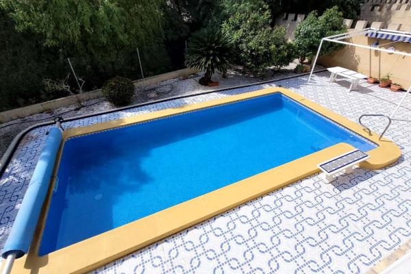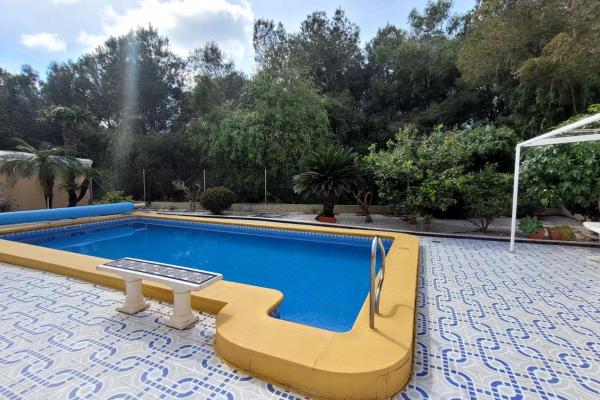 Exterior con una gran parcela, jardín de fácil mantenimiento, una piscina de 8x4 con bomba de calor, cocina exterior, garaje y trastero,